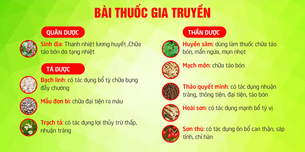 Sau đó, ông đã kết hợp nhiều vị thảo dược quý như đại hoàng, huyền sâm, cam thảo, bạch truật, thục địa… – tất cả đều là thuốc ôn hoà, có tác dụng nhuận tràng, thanh nhiệt, điều hoà tiêu hoá, giúp cơ thể tự cân bằng từ bên trong.