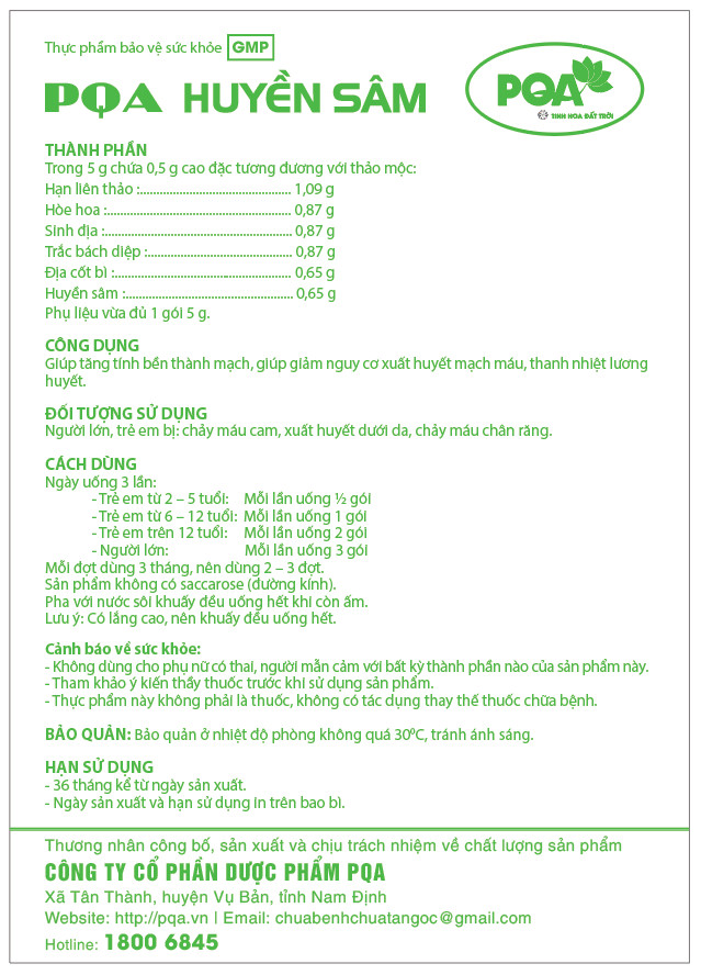 PQA Huyền Sâm là dòng sản phẩm uy tín trên thị trường có khả năng loại bỏ tình trạng chảy máu cam, xuất huyết dưới da, chảy máu chân răng ở người bệnh. Sản phẩm đã và đang nhận được đánh giá cao từ giới chuyên môn và được hầu hết người tiêu dùng an tâm về chất lượng sản phẩm.